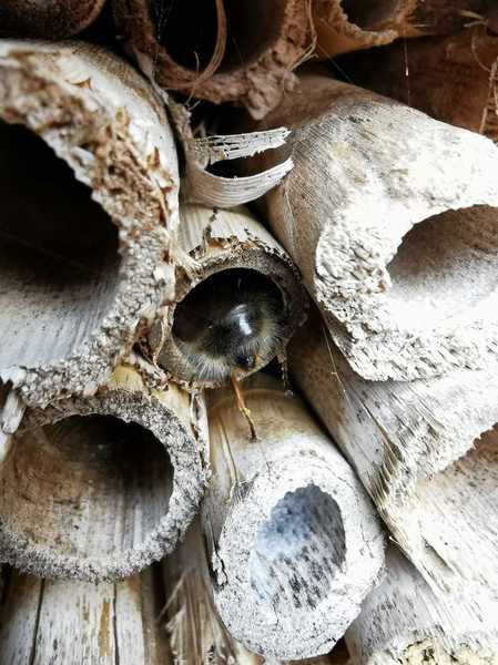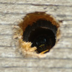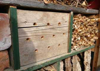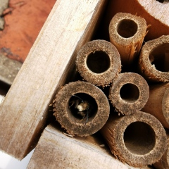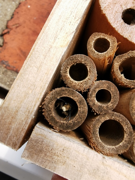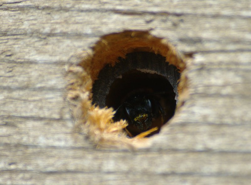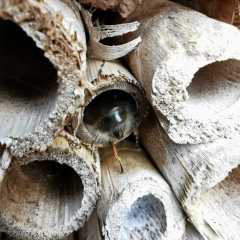 Solitary bees are insects which don’t build “nests” or “hives”. Each one of these bees will mate, and then search for a suitable hole in which to lay their eggs. Eggs are deposited in chambers in each suitable hole, a stock of pollen is prepared within the hole moistened with nectar, and then the adult will seal up the hole with mud, pulped up wood or flower petals. When the egg hatches, the larvae develops in the hole feeding on the nectar and pollen left by the parent. Then when they have finally metamorphosed into a bee, they will leave the hole and the whole cycle starts again!